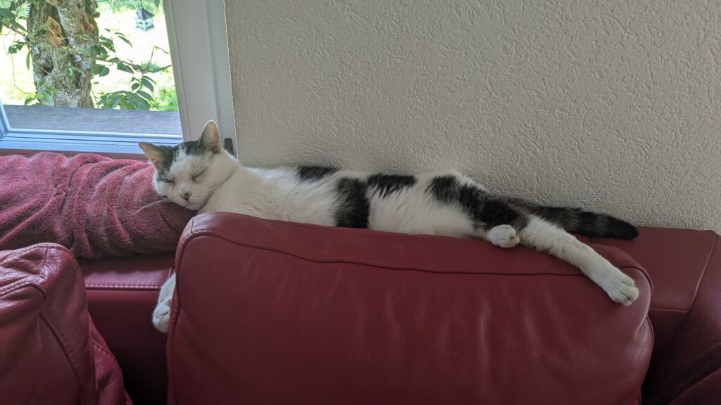 Nero kam 2020 aus dem Tierheim Paradiesli zu uns. Er wurde mit 17-jährig im Tierheim abgegeben weil er angeblich beisst. Bei uns ist er (nachdem er sich an die vielen anderen Katzen gewöhnt hat) zufrieden. Er bleibt meist drinnen und sucht sich immer wieder ein Plätzchen zum schlafen. Uns beisst er nicht, er kann aber sehr laut Miauen, wenn er etwas will oder uns sucht – vermutlich hört er auch nicht mehr sehr gut.