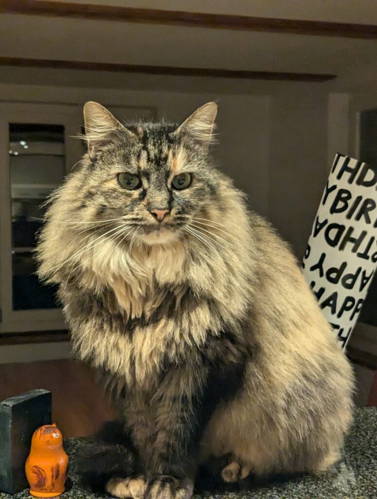Wyomi kam 2017 nach einem langen Aufenthalt im Tierheim Paradiesli zu uns. Sie konnte nicht vermittelt werden, da sie nicht zahm ist. Man kann sie zwar immer noch nicht berühren, sie sucht aber unsere Nähe und schläft bei uns im Wohnzimmer.