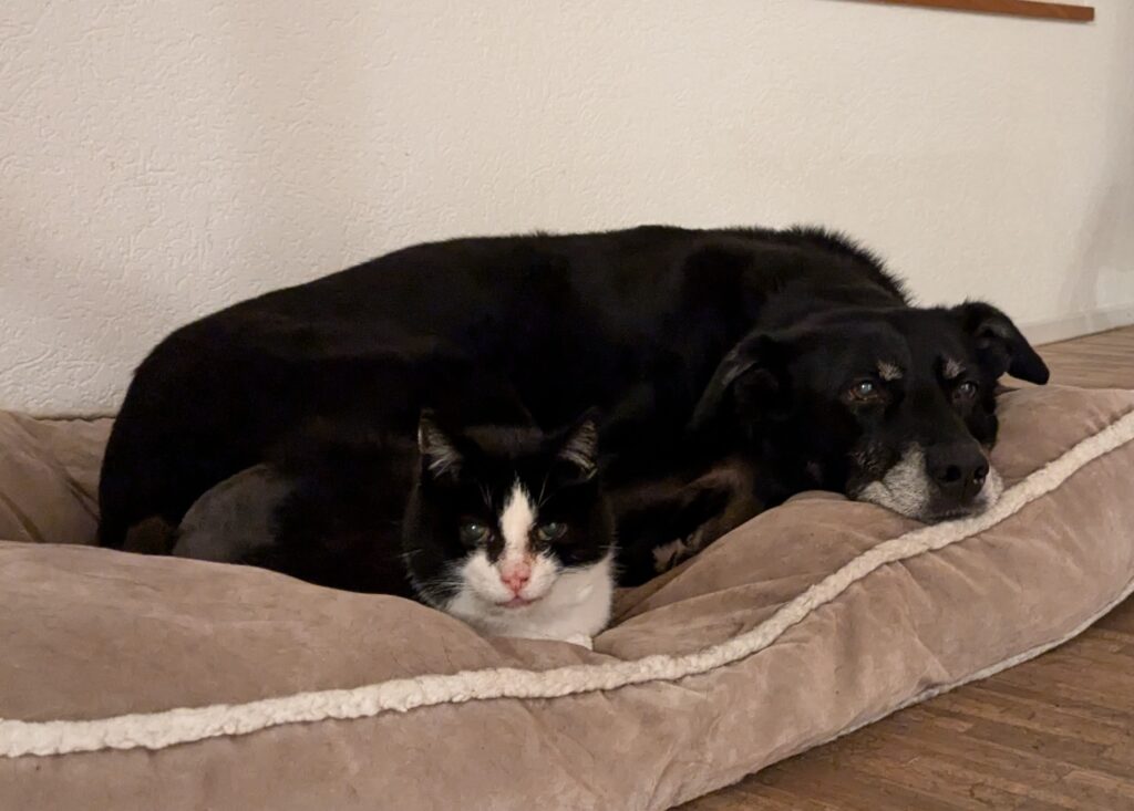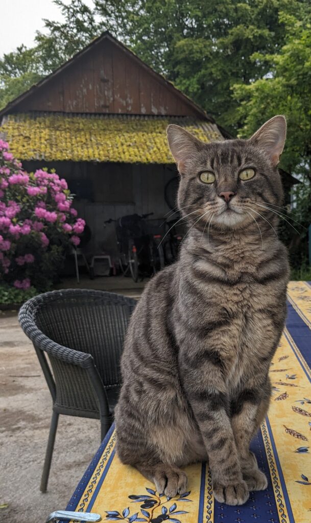 Felice kam als wilde Katze mit 2 Jungen 2014 zu uns. Die beiden kleinen Kätzchen halfen beim Zähmen von Felice und Gurke und konnten nach ein paar Monaten weiter vermittelt werden. Felice ist heute zahm und liebt den Hund meiner Eltern. Sie lebt im Gartenhaus und im Parterre bei meinen Eltern und Louisa, welche die Liebesbekundungen von Felice geduldig über sich ergehen lässt.